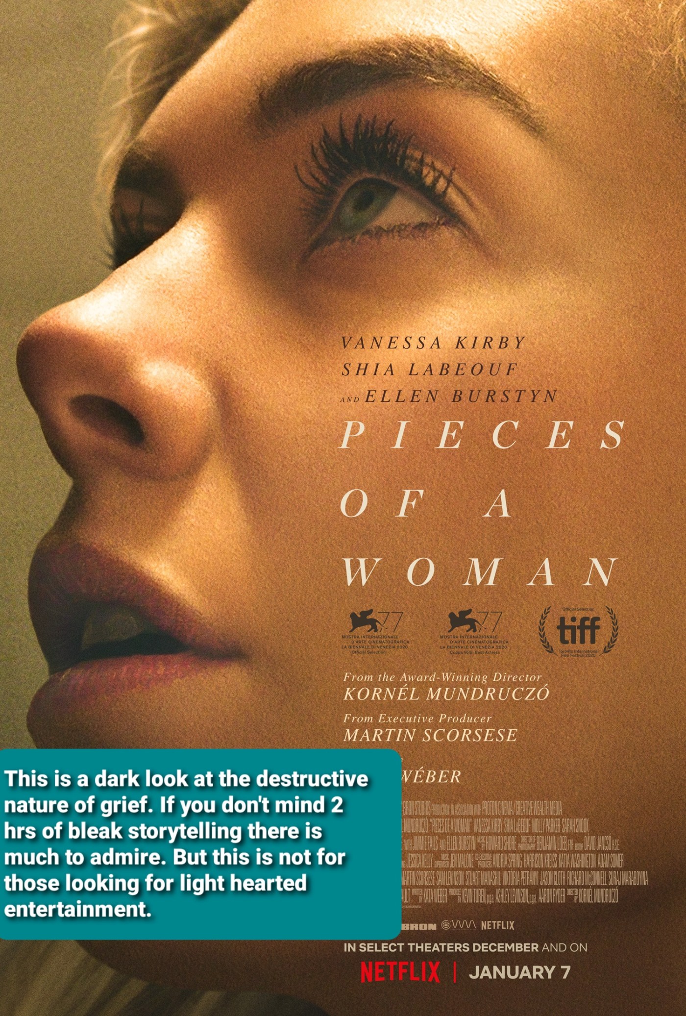 Pieces of a Women is a tough film to enjoy, but does have plenty to admire in the performances and cinematography. However, it fails to build on a powerful opening 30 minutes and as the characters decend into their varying levels of darkness, it is difficult for the narrative to hold together.