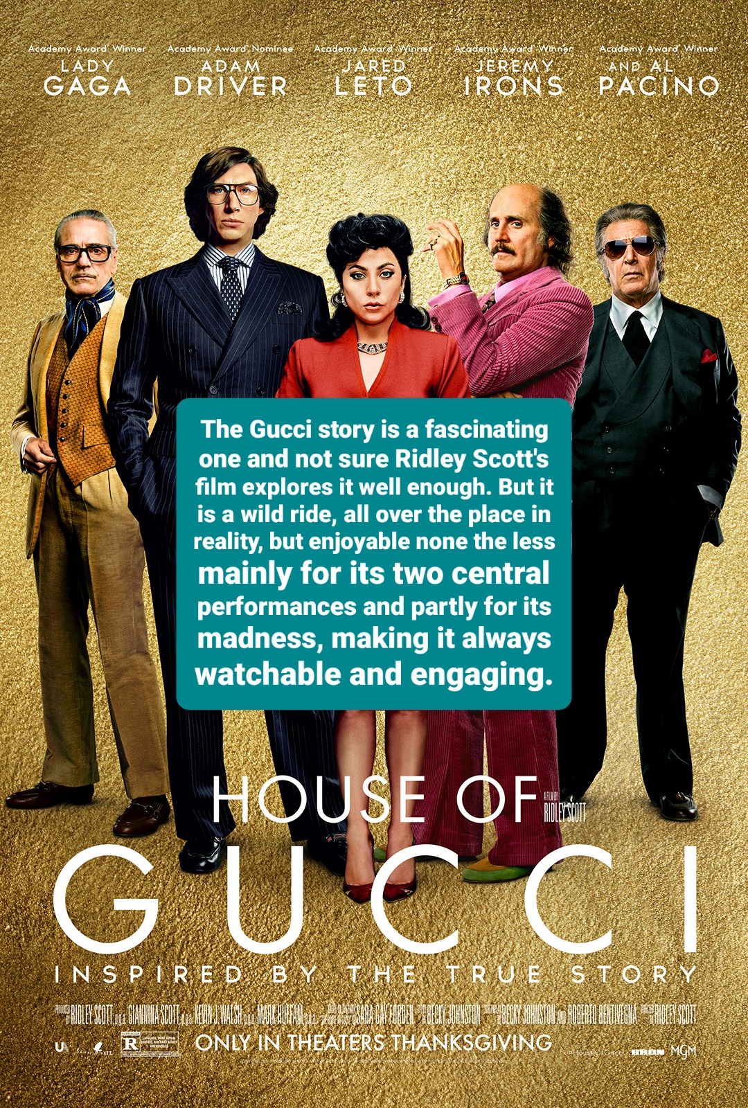 The Gucci story is a fascinating one and not sure Ridley Scott’s film explores it well enough. But it is a wild ride, all over the place in reality, but enjoyable none the less mainly for its two central performances and partly for its madness. Making it always watchable and engaging.