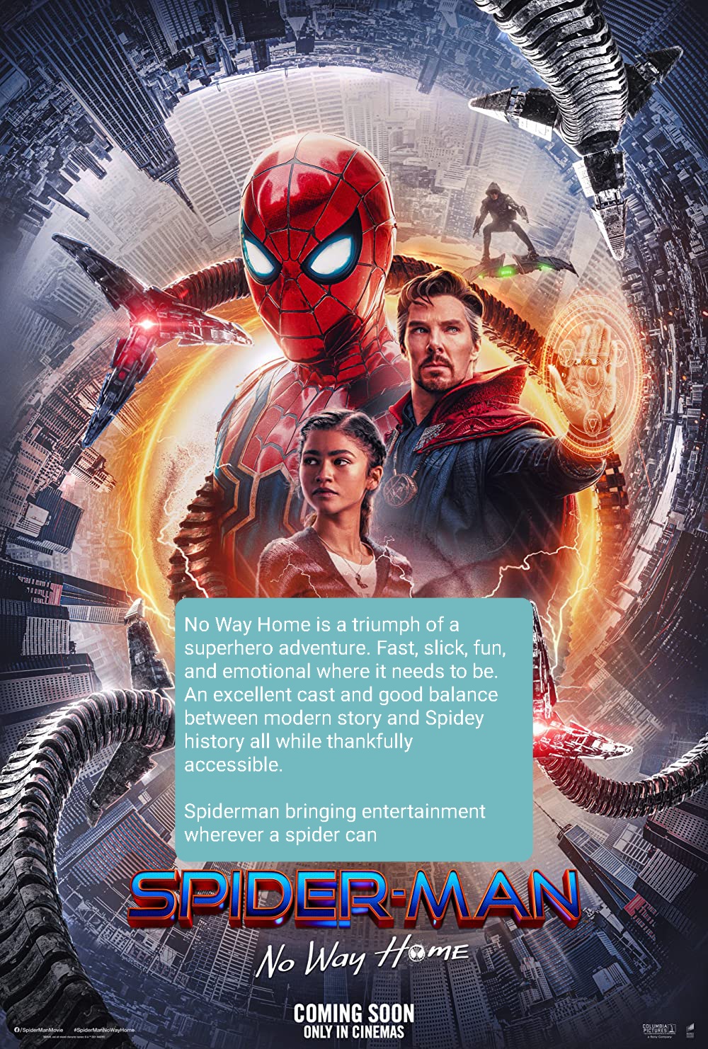 No Way Home is a triumph of a superhero adventure. Fast, slick, fun, and emotional where it needs to be. An excellent cast and good balance between modern story and Spidey history all while thankfully accessible. If you’ve never seen Spidey before, you’ll miss some of the fun, but it won’t matter; you will still have a blast. Spiderman bringing entertainment wherever a spider can.