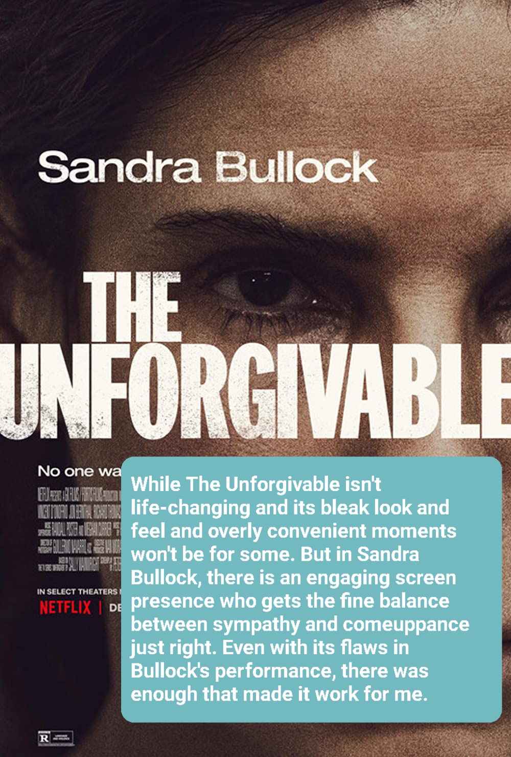 While The Unforgivable isn’t life-changing and its bleak look and feel and overly convenient moments won’t be for some. But in Sandra Bullock, there is an engaging screen presence who gets the fine balance between sympathy and comeuppance just right. Even with its flaws in Bullock’s performance, there was enough that made it work for me.