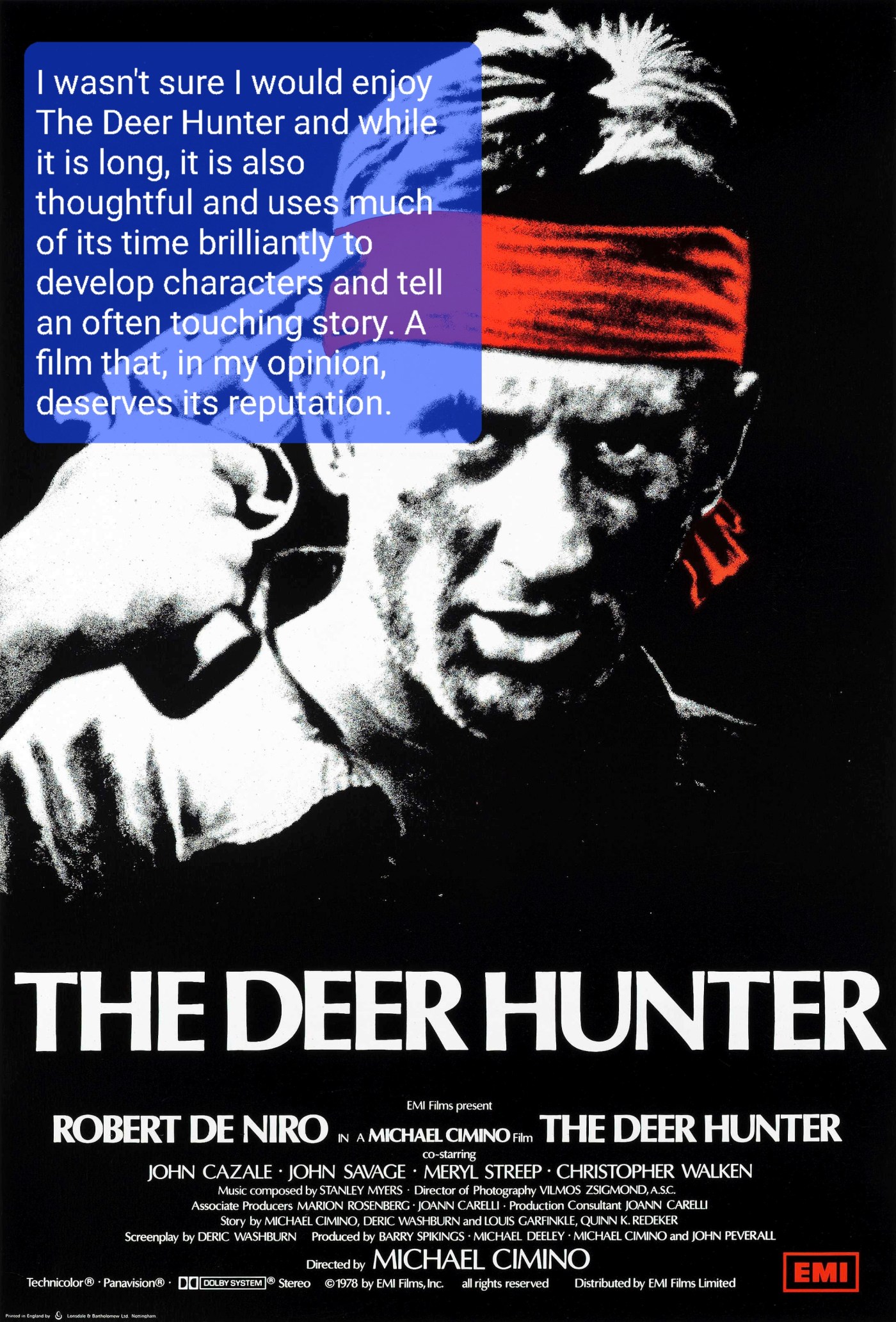 I wasn’t sure I would enjoy The Deer Hunter and while it is long, it is also thoughtful and uses much of its time brilliantly to develop characters and tell an often touching story. A film that, in my opinion, deserves its reputation.
