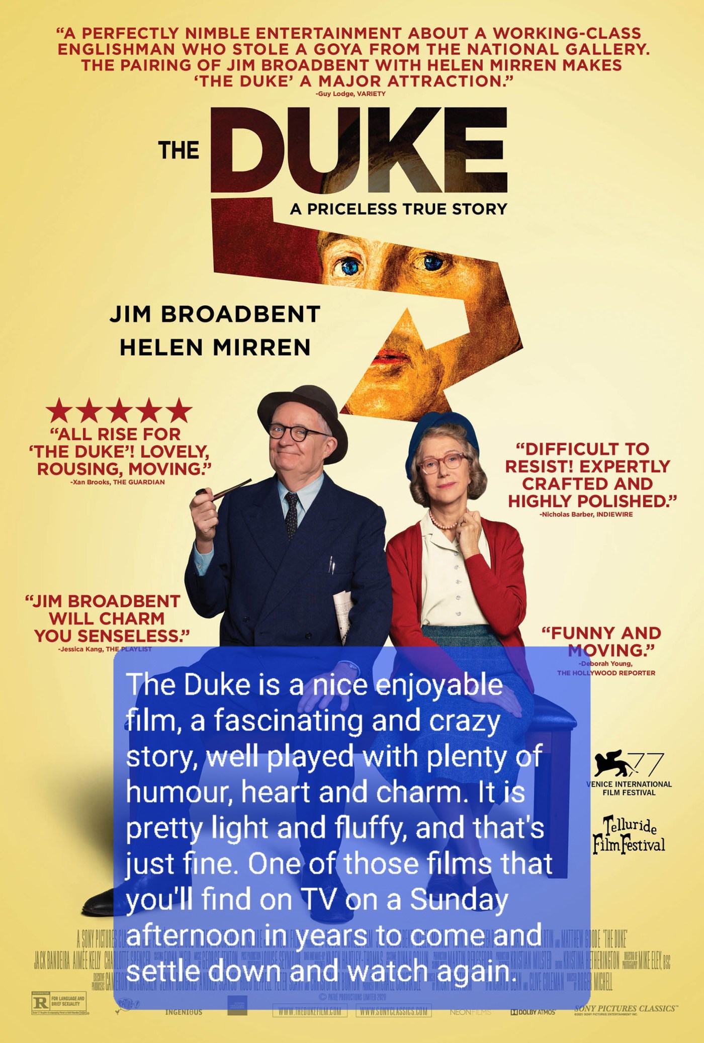 The Duke is a nice enjoyable film, a fascinating and crazy story, well played with plenty of humour, heart and charm. It is pretty light and fluffy, and that’s just fine. One of those films that you’ll find on TV on a Sunday afternoon in years to come and settle down and watch again.