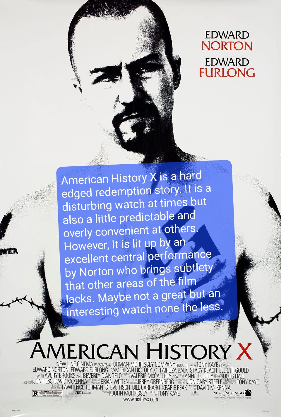 American History X is a hard edged redemption story. It is a disturbing watch at times but also a little predictable and overly convenient at others. However, It is lit up by an excellent central performance by Norton who brings subtlety that other areas of the film lacks. Maybe not a great but an interesting watch none the less.