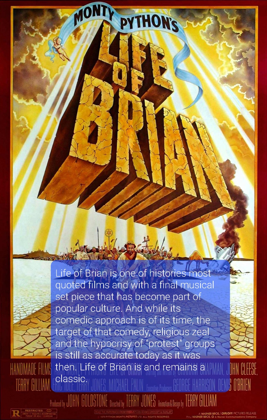 Life of Brian is one of histories most quoted films and with a final musical set piece that has become part of popular culture. And while its comedic approach is of its time, the target of that comedy, religious zeal and the hypocrisy of “protest” groups is still as accurate today as it was then. Life of Brian is and remains a classic.