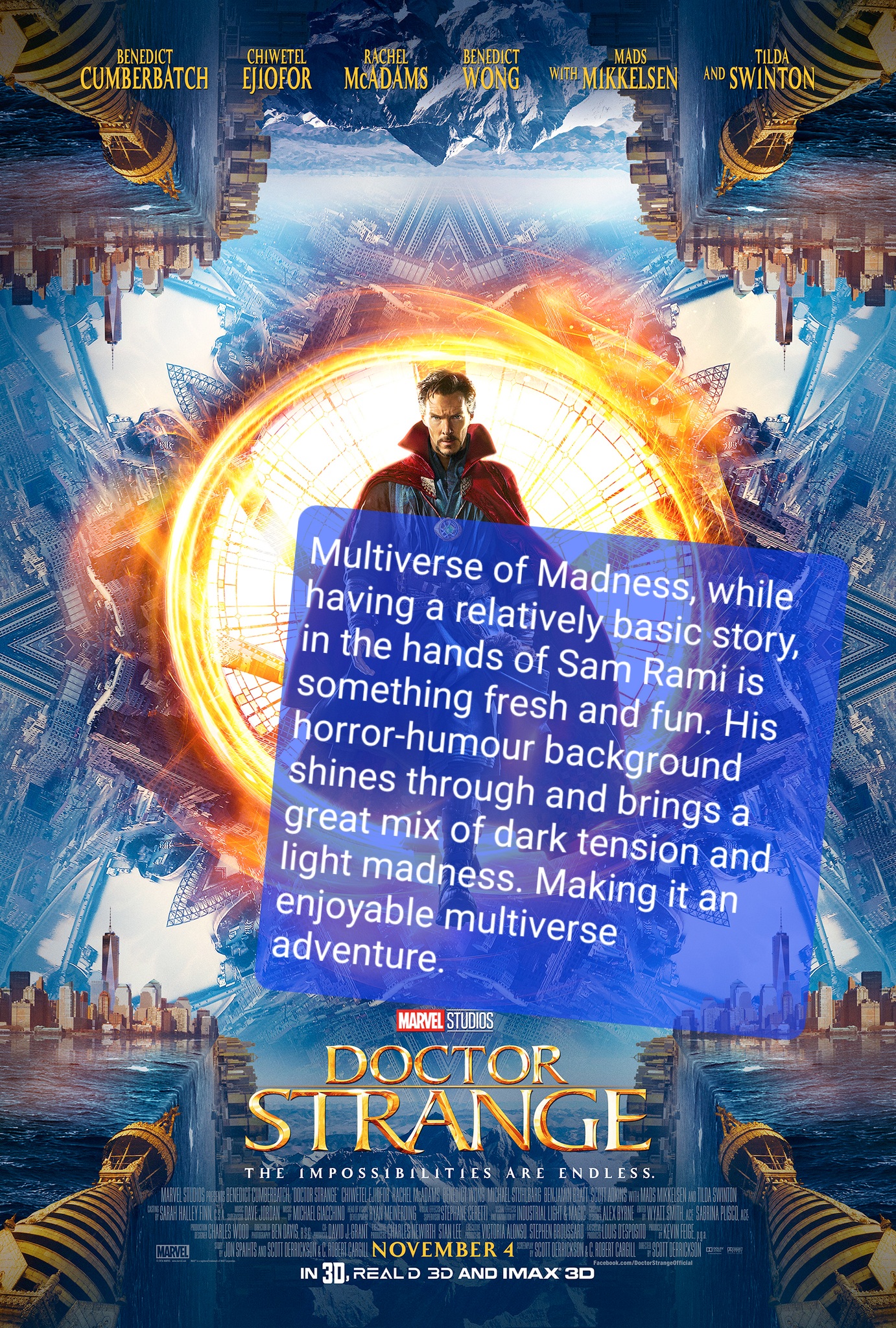 Multiverse of Madness, while having a relatively basic story, in the hands of Sam Rami is something fresh and fun. His horror-humour background shines through and brings a great mix of dark tension and light madness. Making it an enjoyable multiverse adventure.