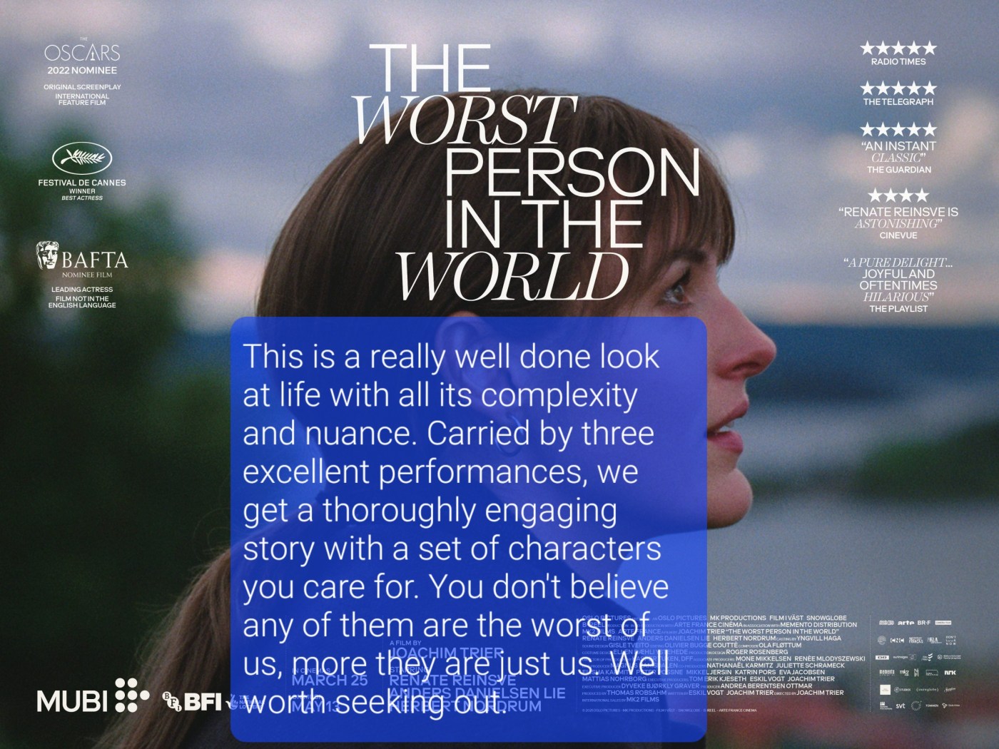 Directed by Joachim Trier and starring Renate Reinsve is this thoughtful and smart story set in contemporary Oslo (yes it is in Norwegian, with subtitles). Reinsve is Julie, who we follow over a four year period as she tries to make sense of her life, her career and relationships. She is smart and talented and has the ability to chase whatever she wants and there’s the problem. She is also directionless, we see her at university change her studies at a whim, surgeon to psychiatrist to photographer. This is reflected in her realtionships as she shys away from long term commitment. And as she reaches 30 she seems as unsure as ever or is she just pursuing a version of life that doesn’t exist.