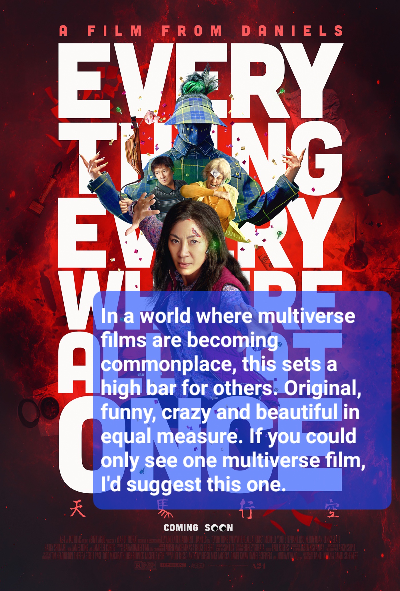 In a world where multiverse films are becoming commonplace, this sets a high bar for others. Original, funny, crazy and beautiful in equal measure. If you could only see one multiverse film, I’d suggest this one.
