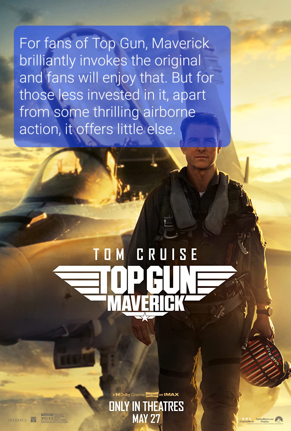 For fans of Top Gun, Maverick brilliantly invokes the original and fans will enjoy that. But for those less invested in it, apart from some thrilling airborne action, it offers little else.