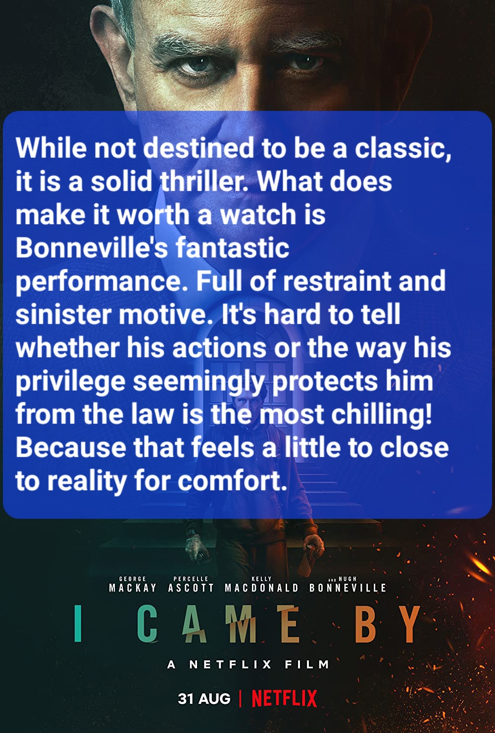 While not destined to be a classic, it is a solid thriller. What makes it worth watching is Bonneville’s fantastic performance which is full of restraint and sinister motive. It’s hard to tell whether his actions or the way his privilege seemingly protects him from the law is the most chilling! Because that feels a little to close to reality for comfort.