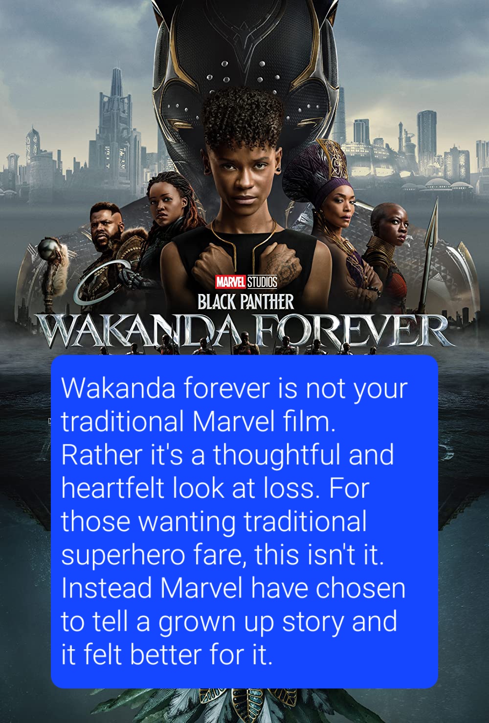 Wakanda forever is not your traditional Marvel film. Rather it’s a thoughtful and heartfelt look at loss. For those wanting traditional superhero fare, this isn’t it. Instead Marvel have chosen to tell a grown up story and it felt better for it.