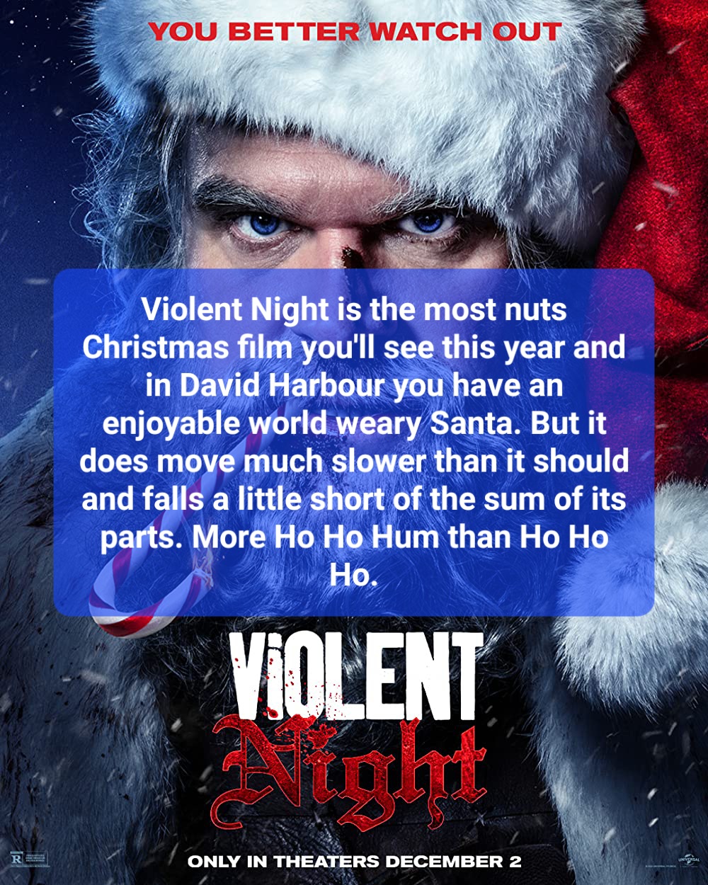 Violent Night is the most nuts Christmas film you’ll see this year and in David Harbour you have an enjoyable world weary Santa. But it does move much slower than it should and falls a little short of the sum of its parts. More Ho Ho Hum than Ho Ho Ho.