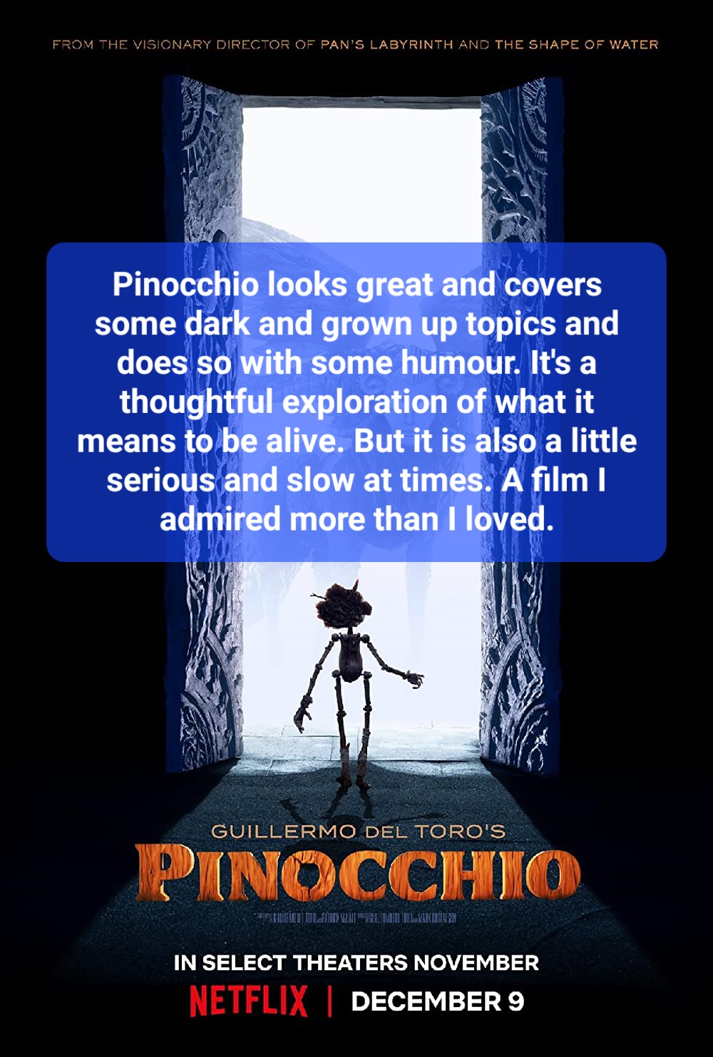 For all its positives, I didn’t quite connect with Pinocchio, whether it was the pacing or its seriousness it didn’t quite appeal to me as much as it could have.