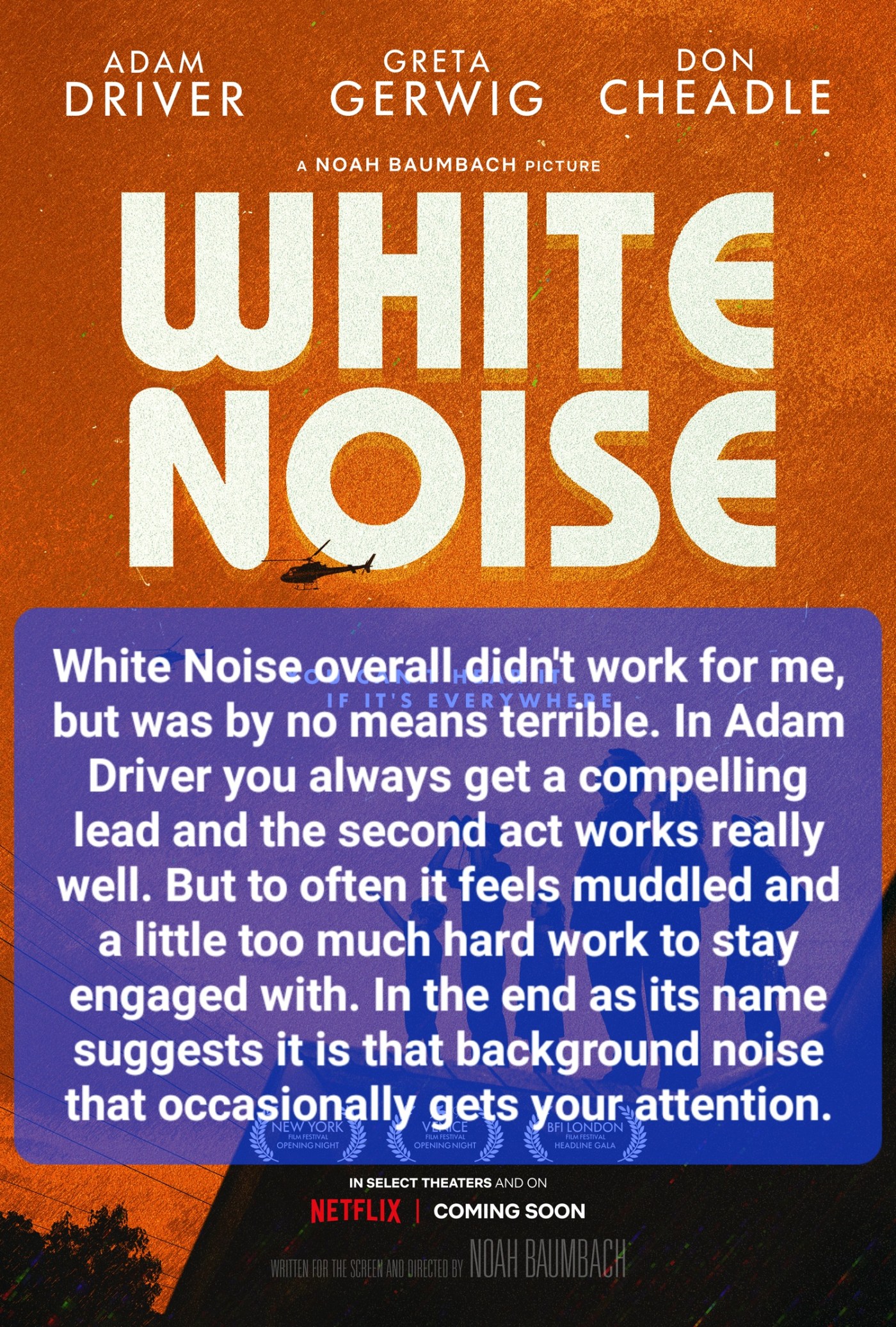 White Noise overall didn’t work for me, but was by no means terrible. In Adam Driver you always get a compelling lead and the second act works really well. But to often it feels muddled and a little too much hard work to stay engaged with. In the end as its name suggests it is that background noise that occasionally gets your attention.