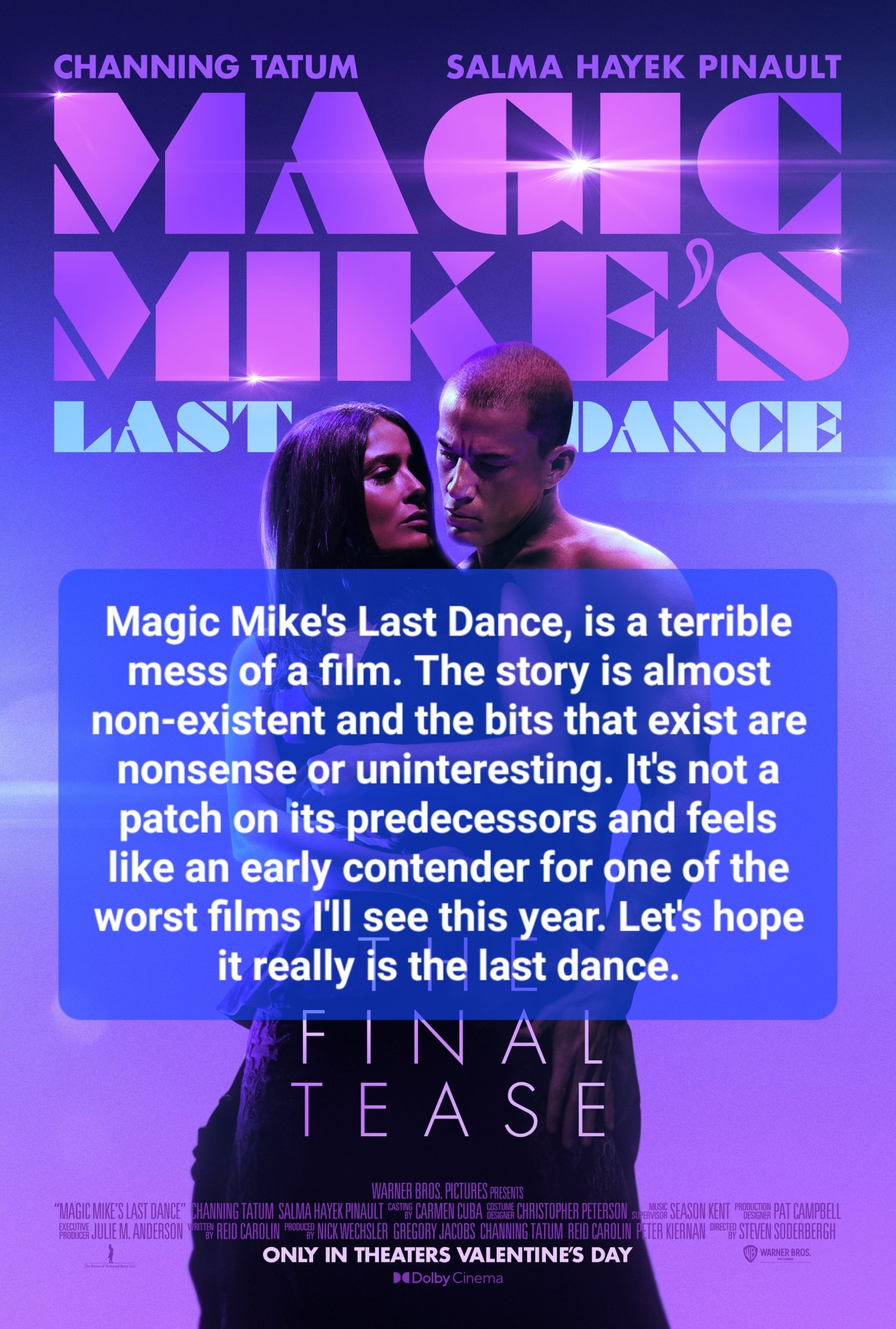 Magic Mike’s Last Dance is a terrible mess of a film. The story is almost non-existent and the bits that exist are nonsense or uninteresting. It’s not a patch on its predecessors and feels like an early contender for one of the worst films I’ll see this year. Let’s hope it really is the last dance.