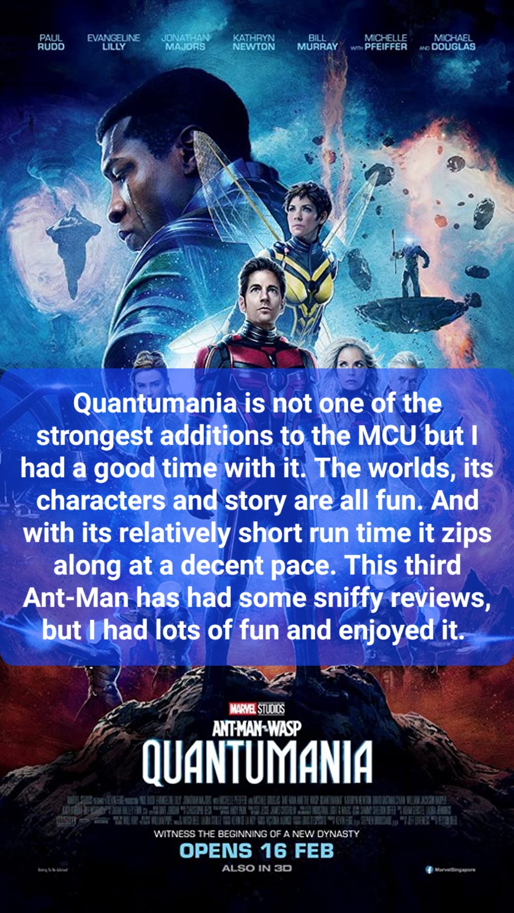 Quantumania is not one of the strongest additions to the MCU but I had a good time with it. The worlds, its characters and story are all fun. And with its relatively short run time it zips along at a decent pace. This third Ant-Man has had some sniffy reviews, but I had lots of fun and enjoyed it.