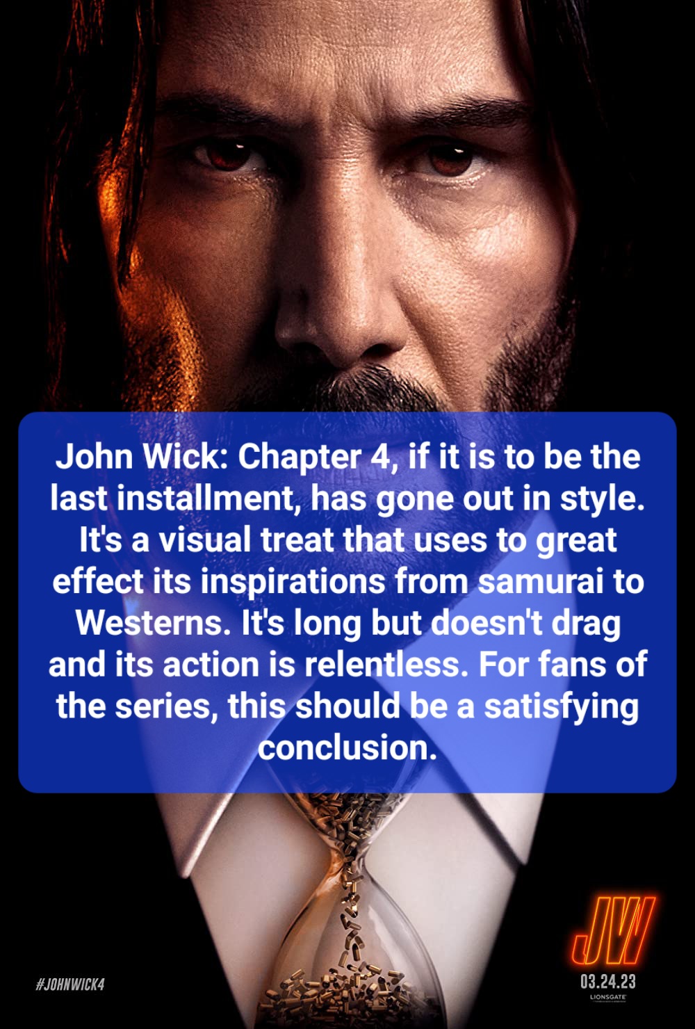 John Wick: Chapter 4, if it is to be the last installment, has gone out in style. It’s a visual treat that uses to great effect its inspirations from samurai to Westerns. It’s long but doesn’t drag and its action is relentless. For fans of the series, this should be a satisfying conclusion.