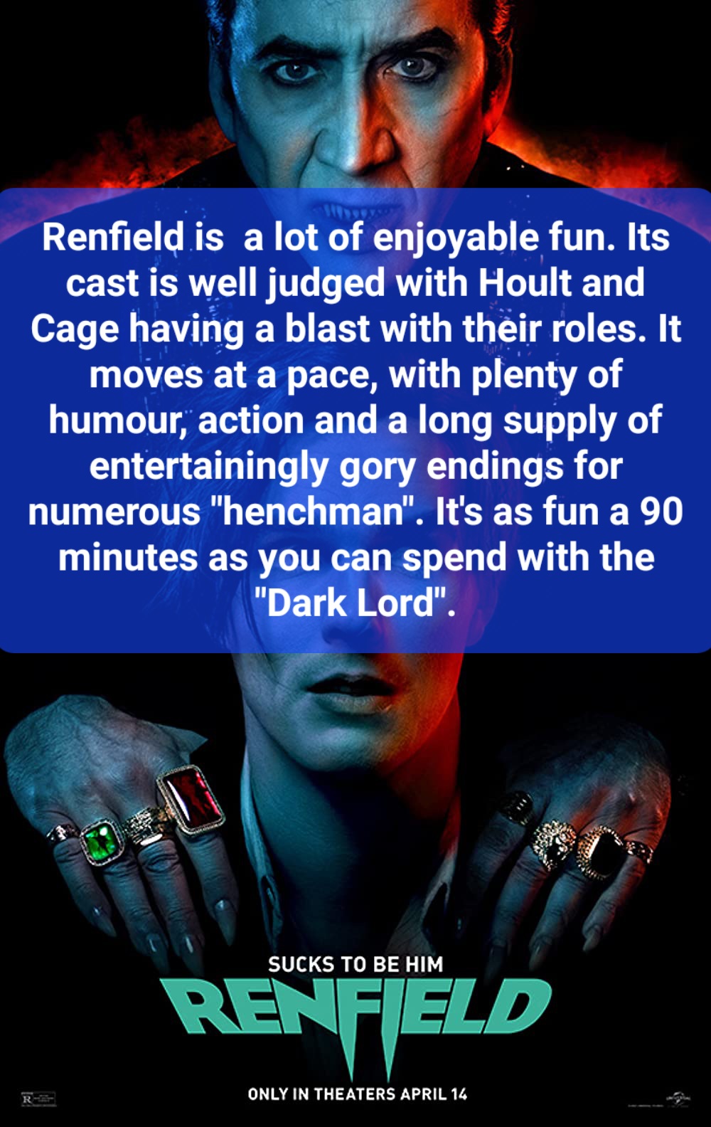 Renfield is a lot of enjoyable fun. Its cast is well judged with Hoult and Cage having a blast with their roles. It moves at a pace, with plenty of humour, action and a long supply of entertainingly gory endings for numerous “henchman”. It’s as fun a 90 minutes as you can spend with the “Dark Lord”.