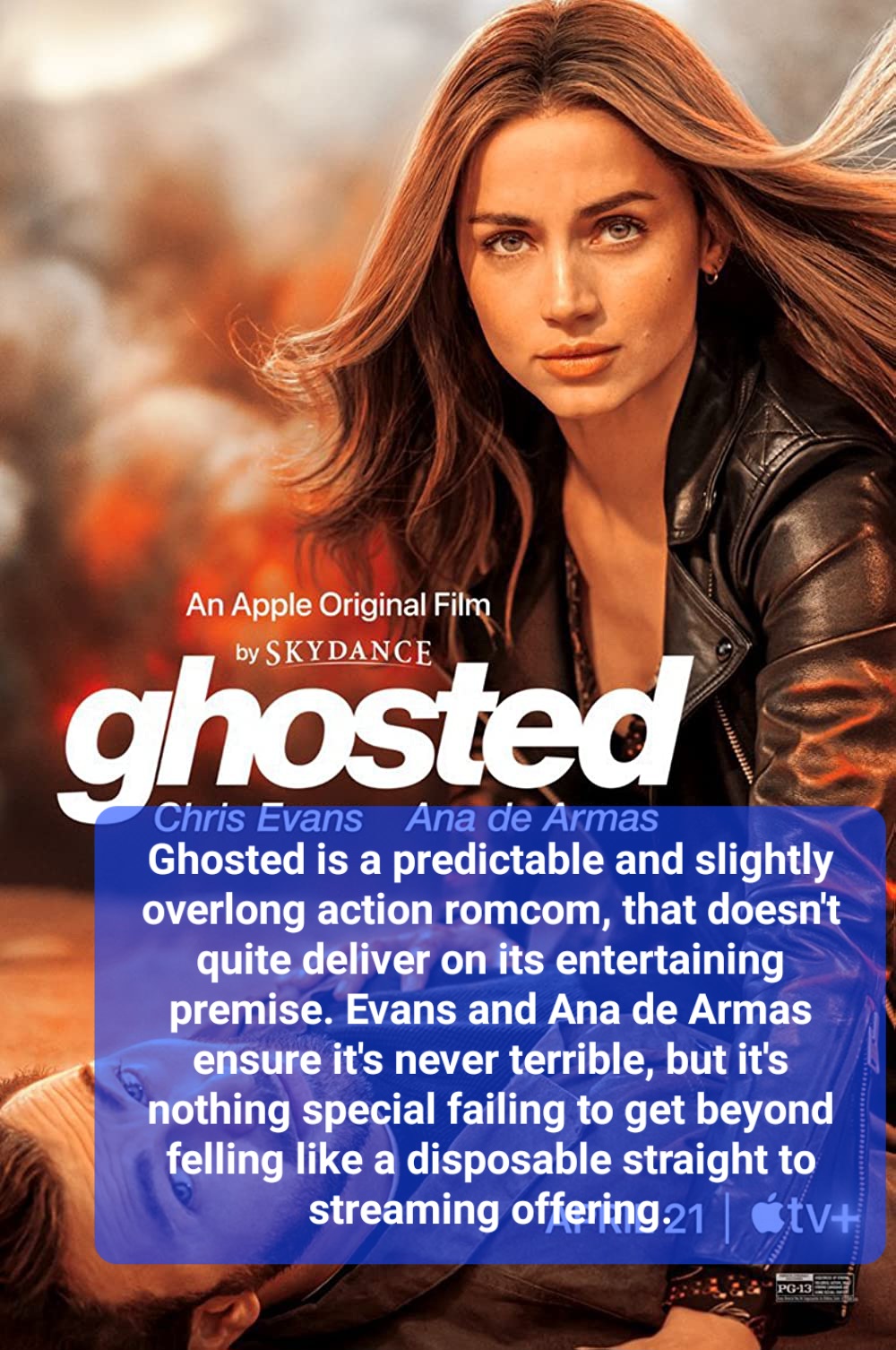 Ghosted is a predictable and slightly overlong action romcom, that doesn’t quite deliver on its entertaining premise. Evans and Ana de Armas ensure it’s never terrible, but it’s nothing special failing to get beyond felling like a disposable straight to streaming offering.