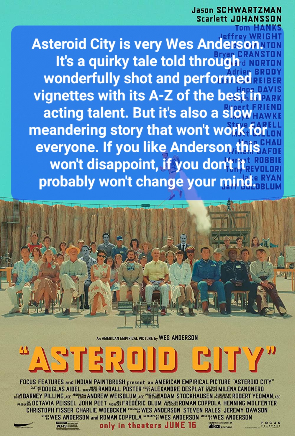 Asteroid City is very Wes Anderson. It’s a quirky tale told through wonderfully shot and performed vignettes with its A-Z of the best in acting talent. But it’s also a slow meandering story that won’t work for everyone. If you like Anderson this won’t disappoint, if you don’t it probably won’t change your mind.