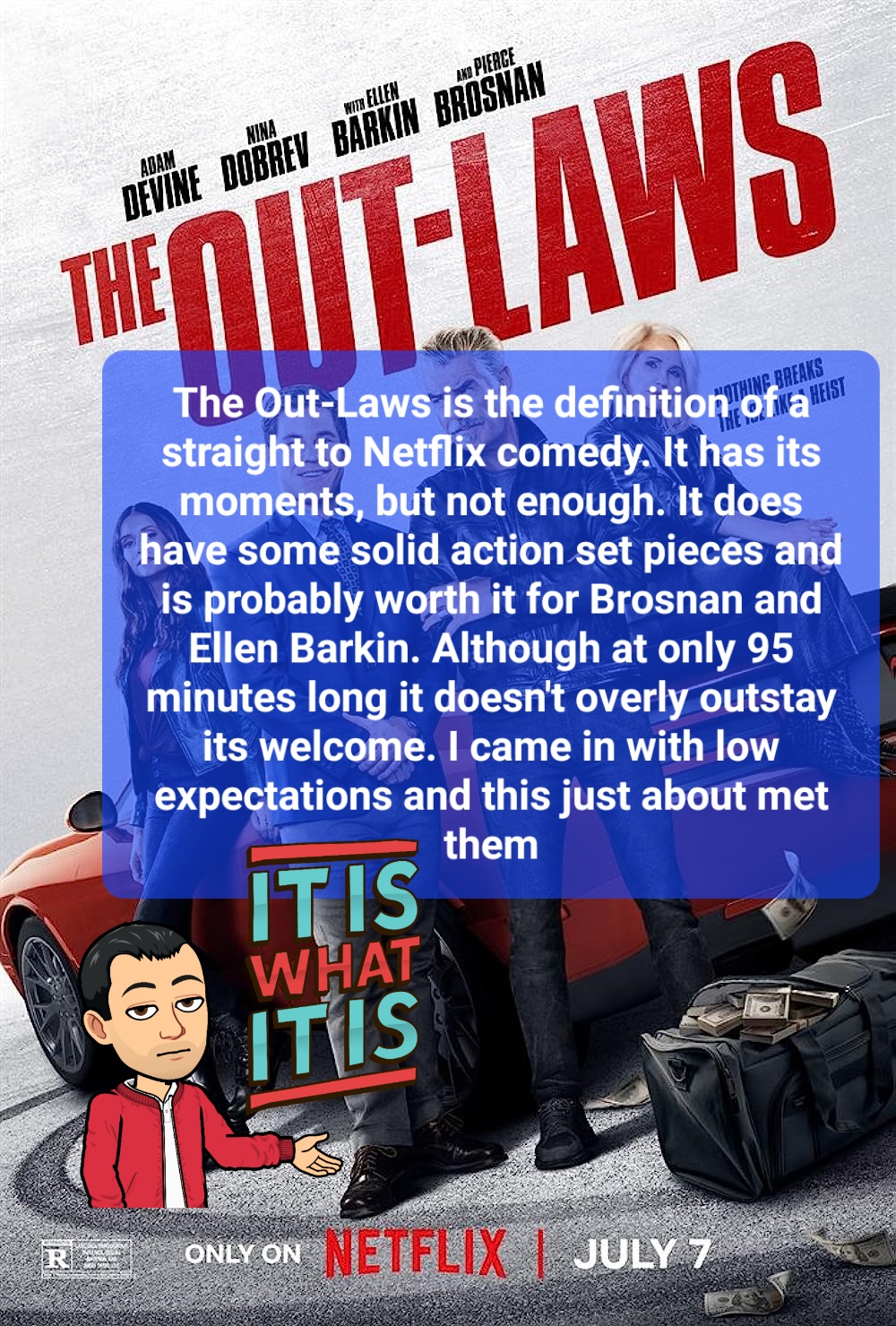 The Out-Laws is the definition of a straight to Netflix comedy. It has its moments, but not enough. It does have some solid action set pieces and is probably worth it for Brosnan and Ellen Barkin. Although at only 95 minutes long it doesn’t overly outstay its welcome. I came in with low expectations and this just about met them.