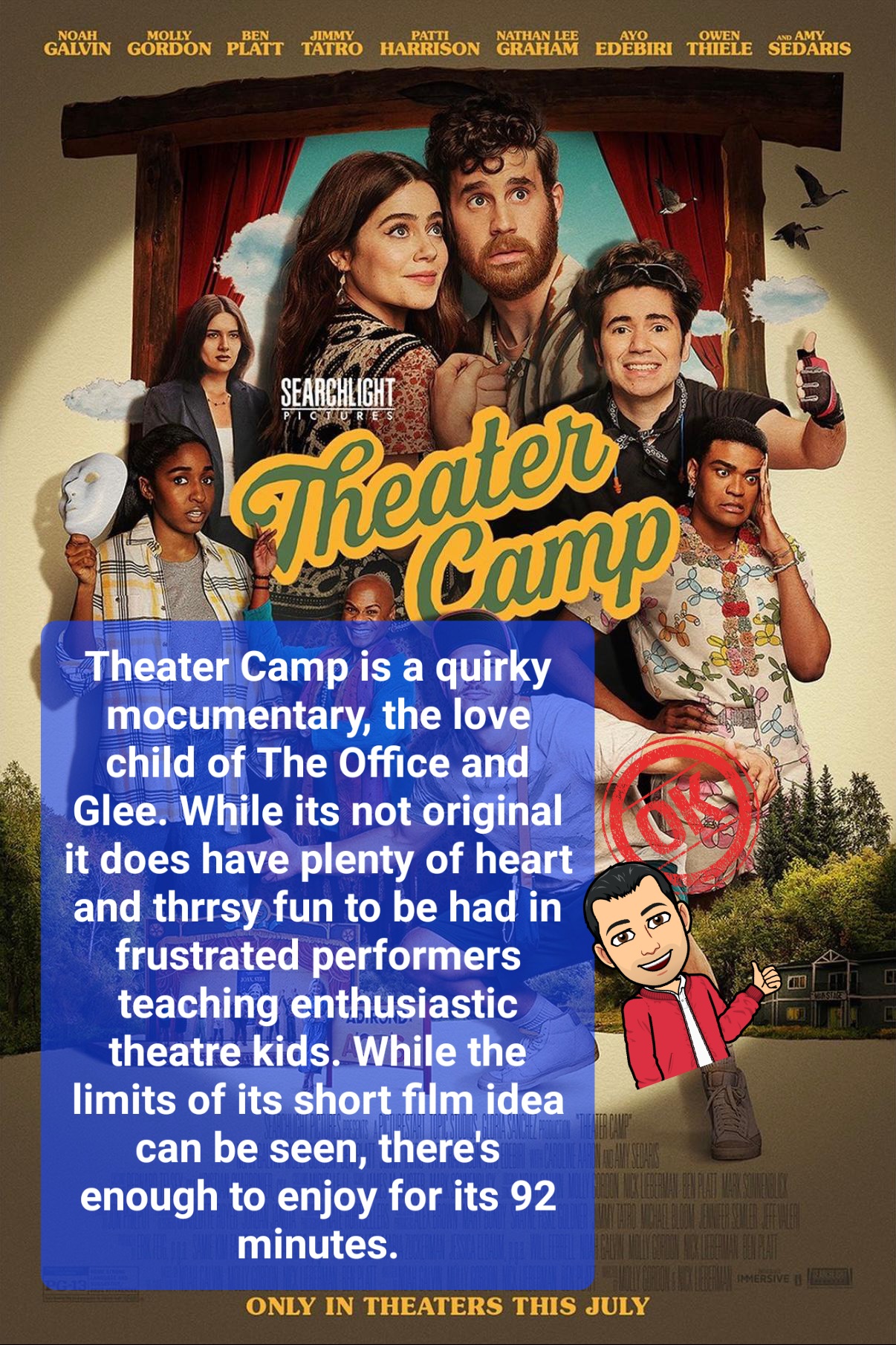 Theater Camp is a quirky mocumentary, the love child of The Office and Glee. While its not original it does have plenty of heart and there’s fun to be had in frustrated performers teaching enthusiastic theater kids. While the limits of its short film idea can be seen, there’s enough to enjoy for its 92 minutes.