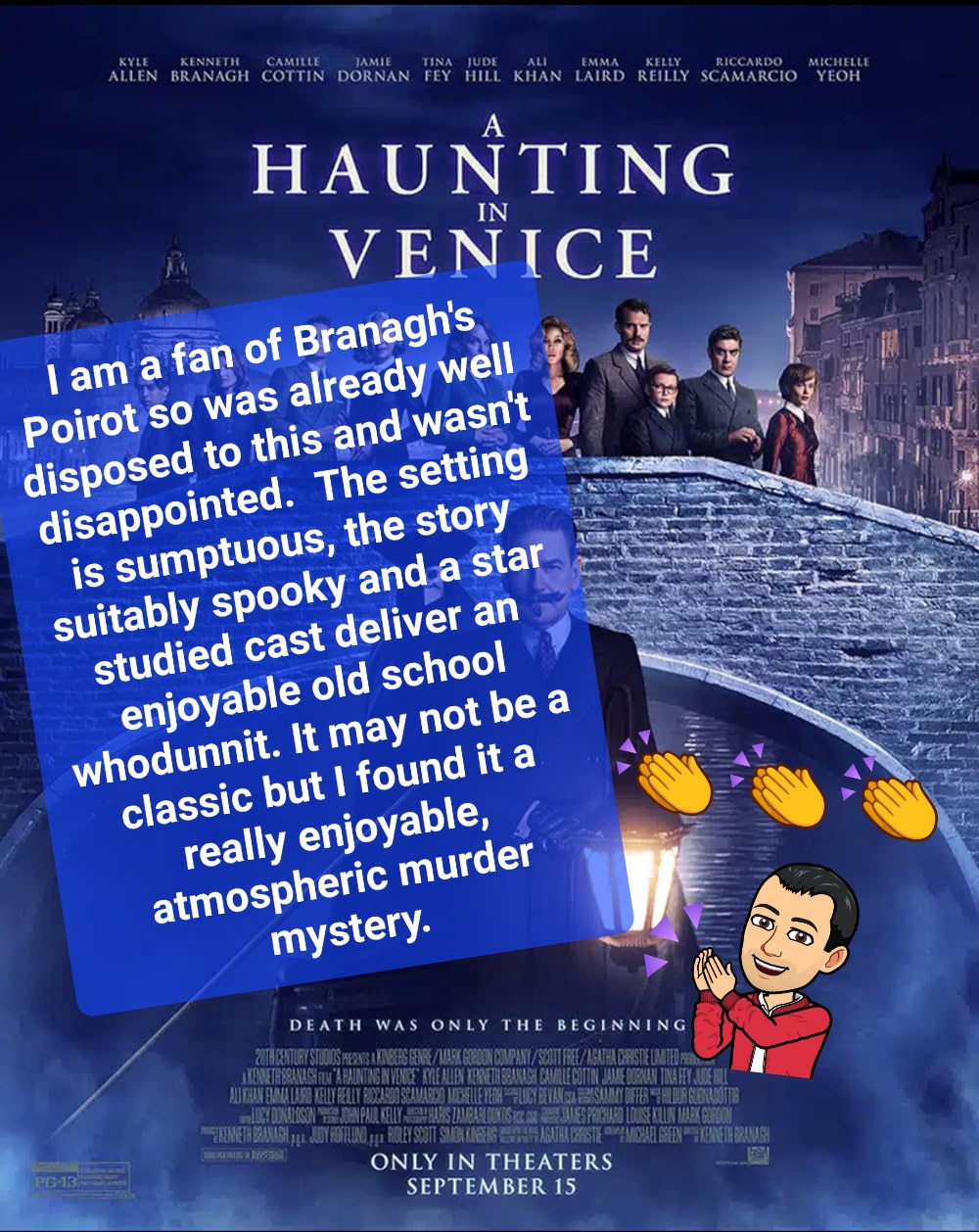I am a fan of Branagh’s Poirot so was already well disposed to this and wasn’t disappointed. The setting is sumptuous, the story suitably spooky and a star studied cast deliver an enjoyable old school whodunnit. It may not be a classic but I found it a really enjoyable, atmospheric murder mystery.