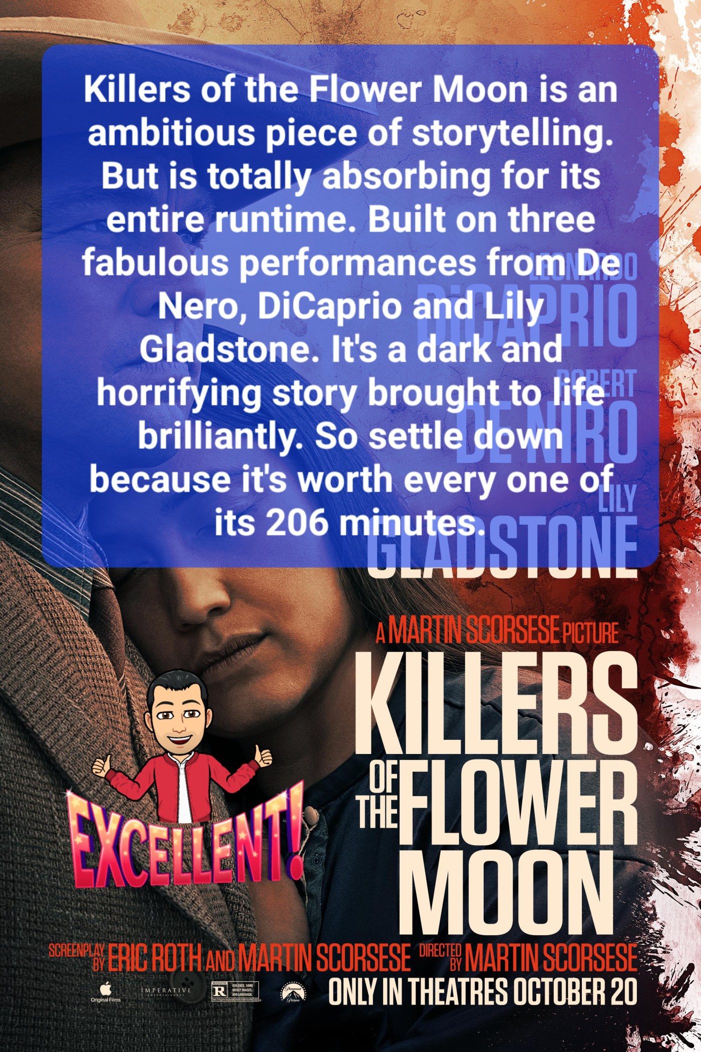 Killers of the Flower Moon is an ambitious piece of storytelling. But is totally absorbing for its entire runtime. Built on three fabulous performances from De Nero, DiCaprio and Lily Gladstone. It’s a dark and horrifying story brought to life brilliantly. So settle down because it’s worth every one of its 206 minutes.