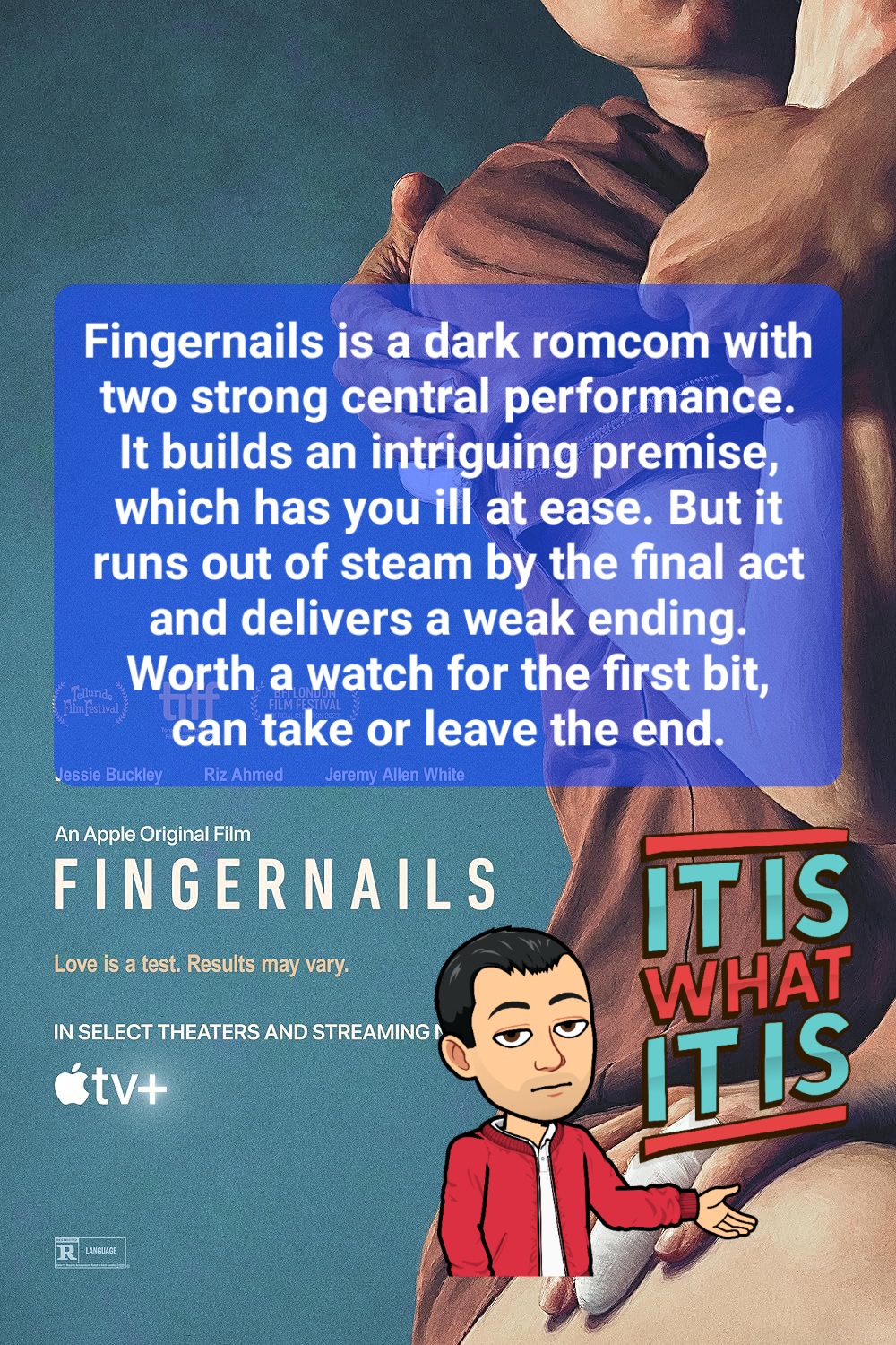 Fingernails is a dark romcom with two strong central performance. It builds an intriguing premise, which has you ill at ease. But it runs out of steam by the final act and delivers a weak ending. Worth a watch for the first bit, can take or leave the end.