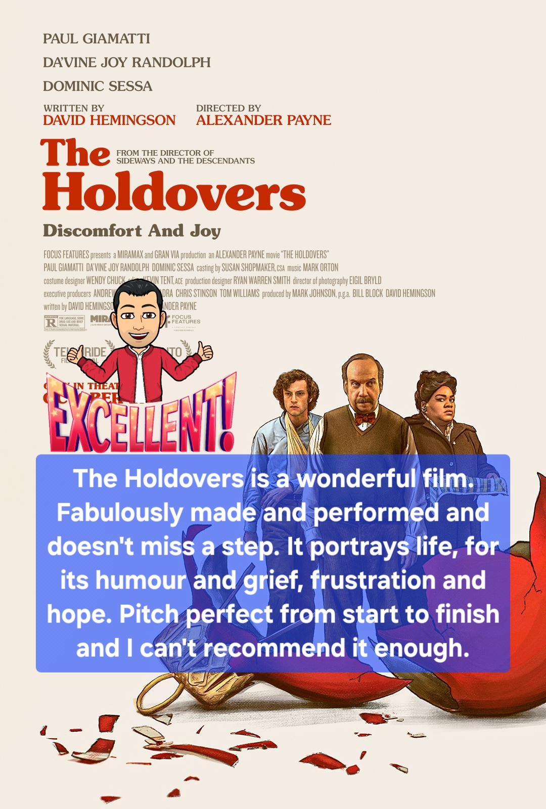 The Holdovers is a wonderful film. Fabulously made and performed and doesn’t miss a step. It portrays life, for its humour and grief, frustration and hope. Pitch perfect from start to finish and I can’t recommend it enough.