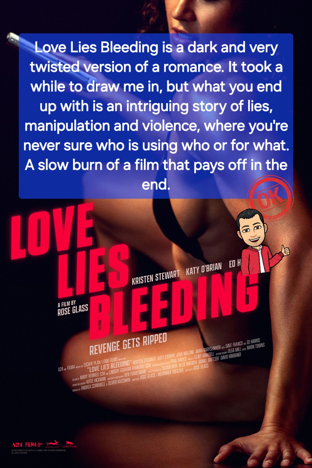 Love Lies Bleeding is a dark and very twisted version of a romance. It took a while to draw me in, but what you end up with is an intriguing story of lies, manipulation and violence, where you’re never sure who is using who or for what. A slow burn of a film that pays off in the end.