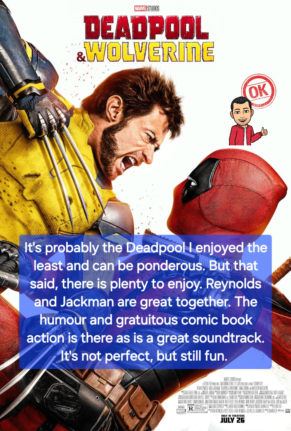 It’s probably the Deadpool I enjoyed the least and can feel slow. But that said, there is plenty to enjoy. Reynolds and Jackman are great together. The humour and gratuitous comic book action is there as is a great soundtrack. It’s not perfect, but still fun.