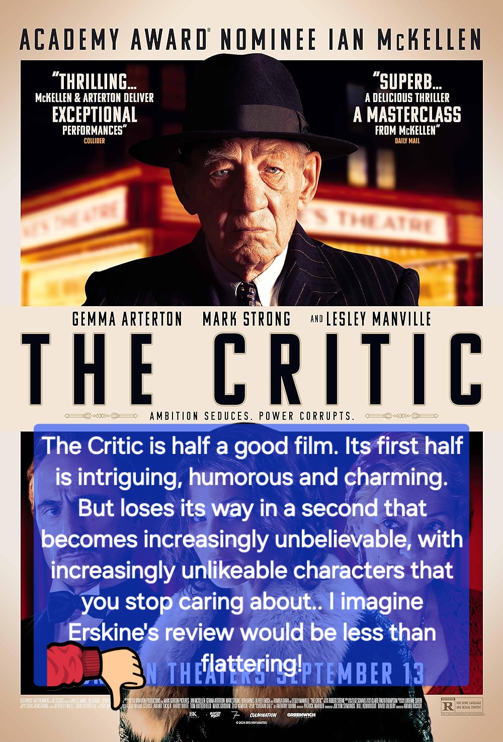 The Critic is half a good film. Its first half is intriguing, humorous and charming. But loses its way in a second that becomes increasingly unbelievable, with increasingly unlikeable characters that you stop caring about.. I imagine Erskine’s review would be less than flattering!