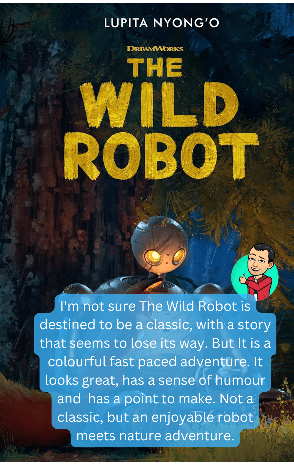 I’m not sure The Wild Robot is destined to be a classic, with a story that seems to lose its way. But It is a colourful fast paced adventure. It looks great, has a sense of humour and has a point to make. Not a classic, but an enjoyable robot meets nature adventure.
