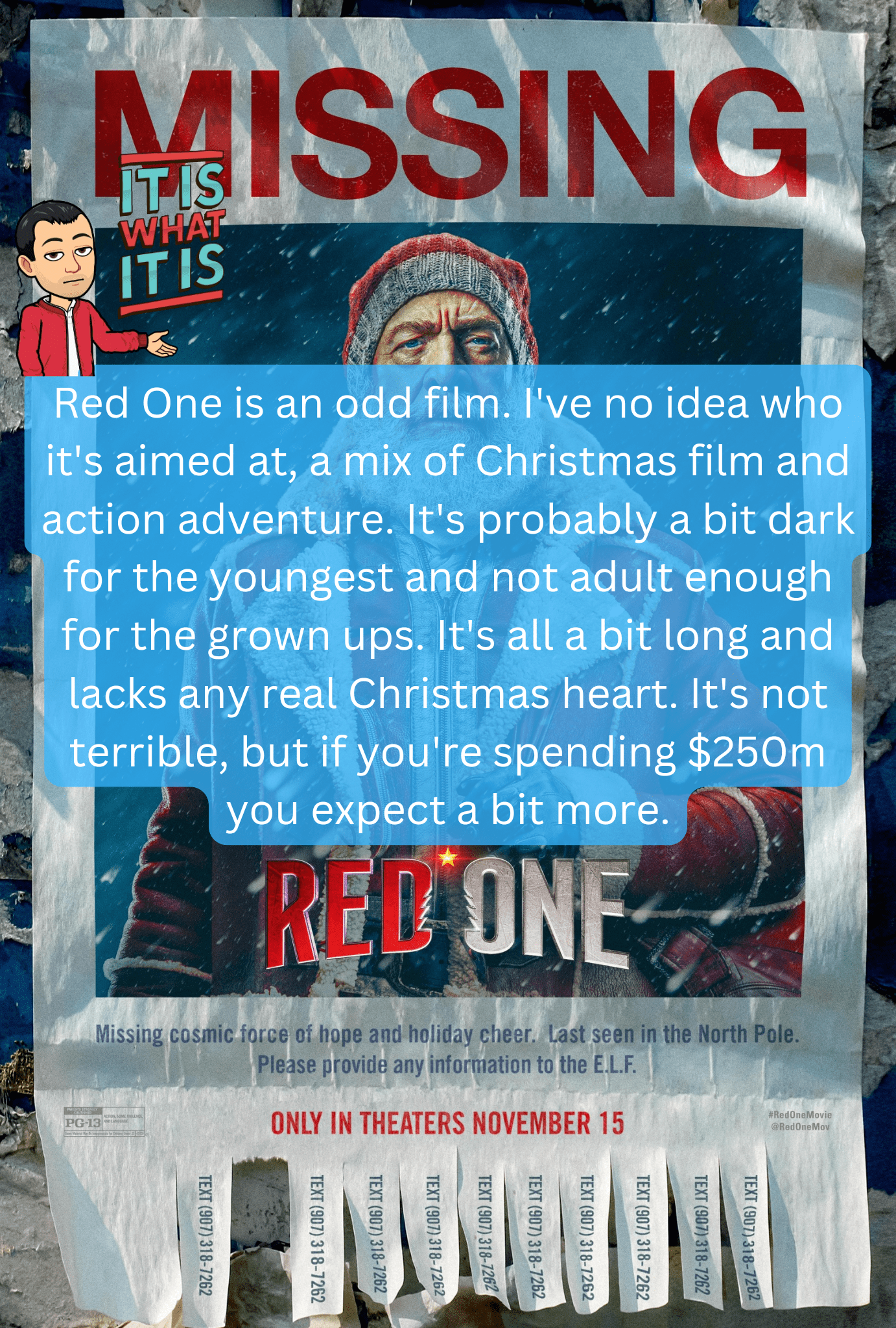 Red One is an odd film. I’ve no idea who it’s aimed at, a mix of Christmas film and action adventure. It’s probably a bit dark for the youngest and not adult enough for the grown ups. It’s all a bit long and lacks any real Christmas heart. It’s not terrible, but if you’re spending $250m you expect a bit more.