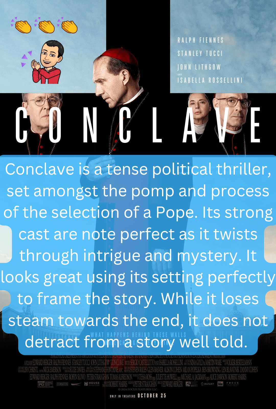 Conclave is a tense political thriller, set amongst the pomp and process of the selection of a Pope. Its strong cast are note perfect as it twists through intrigue and mystery. It looks great using its setting perfectly to frame the story. While it loses steam towards the end, it does not detract from a story well told.