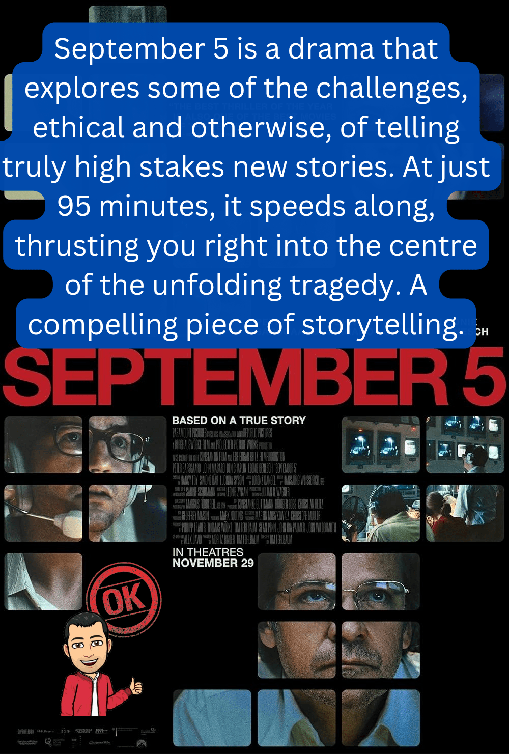 September 5 is a drama that explores some of the challenges, ethical and otherwise, of telling truly high stakes new stories. At just 95 minutes, it speeds along, thrusting you right into the centre of the unfolding tragedy. A compelling piece of storytelling.