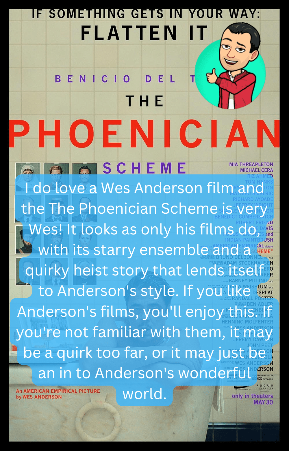 I do love a Wes Anderson film and the The Phoenician Scheme is very Wes! It looks as only his films do, with its starry ensemble and a quirky heist story that lends itself to Anderson’s style. If you like Anderson’s films, you’ll enjoy this. If you’re not familiar with them, it may be a quirk too far, or it may just be an in to Anderson’s wonderful world.