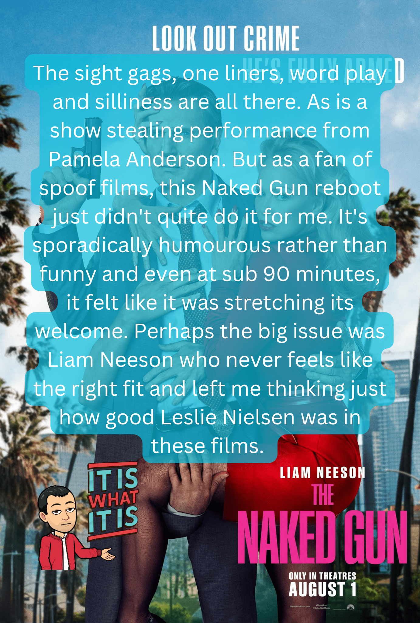 The sight gags, one liners, word play and silliness are all there. As is a show stealing performance from Pamela Anderson. But as a fan of spoof films, this Naked Gun reboot just didn’t quite do it for me. It’s sporadically humourous rather than funny and even at sub 90 minutes, it felt like it was stretching its welcome. Perhaps the big issue was Liam Neeson who never feels like the right fit and left me thinking just how good Leslie Nielsen was in these films.