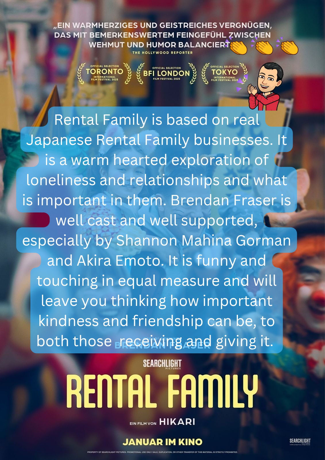 Phillip (Brendan Fraser) is an American actor living in Tokyo. Struggling for work he is hired by Rental Family, a company which provides actors to play stand-in family members and friends for strangers. While reluctant he takes the job and is soon put to work as a pretend Groom. He then moves on to longer term projects, including acting as an father to a young girl and as a journalist profiling a retired actor worried that he his work is been forgotten. As Philip becomes emotionally attached to his clients the line between acting and reality blurs. And when lines are crossed, there are real life consequences that puts the business and Philip’s life in Japan at risk