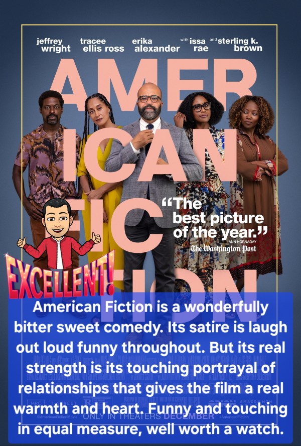 American Fiction is a fabulous bitter sweet comedy balancing comedy and satire perfectly. It is also a really well written, well played, piece about family, love, loss and relationships, often touching and moving.