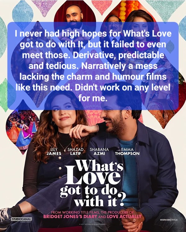 I never had high hopes for What’s Love got to do with It, but it failed to even meet those. Derivative, predictable and tedious. Narratively a mess and lacking the charm and humour films like this need. It didn’t work on any level for me.