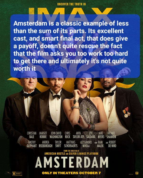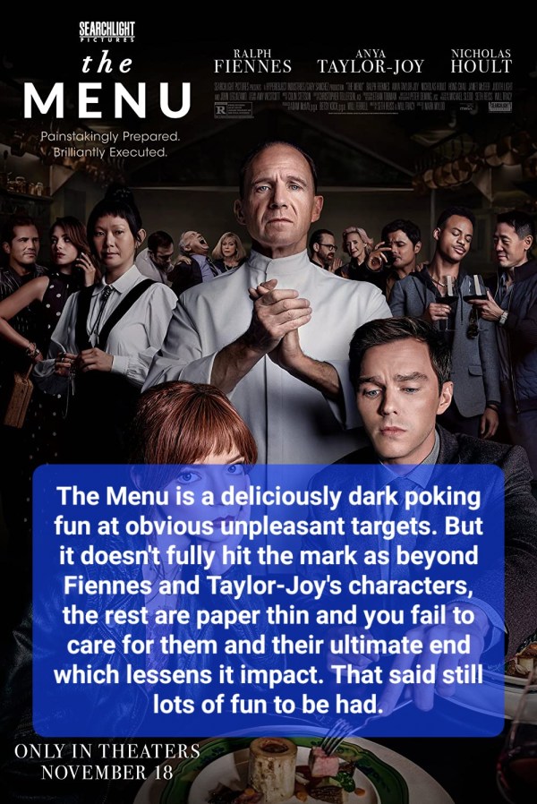 The Menu is a deliciously dark poking fun at obvious unpleasant targets. But it doesn’t fully hit the mark as beyond Fiennes and Taylor-Joy’s characters, the rest are paper thin and you fail to care for them and their ultimate end lessening its impact. That said still lots of fun to be had.