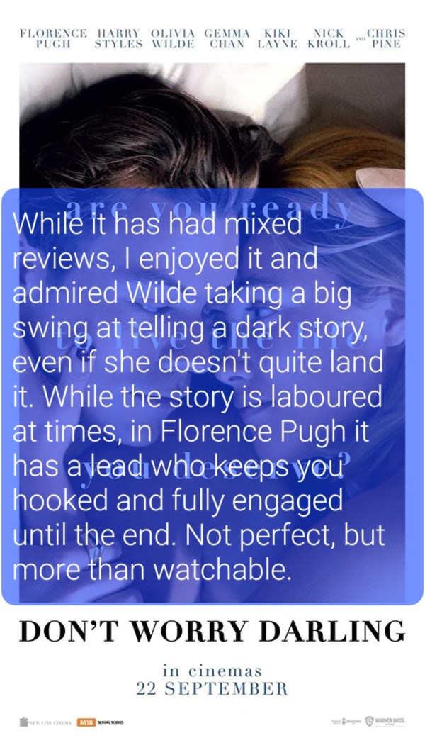 While it’s had a supposedly troubled production and some mixed reviews, I enjoyed it. Wilde has taken a big swing at an idea and while she doesn’t land it perfectly, I admired the attempt.