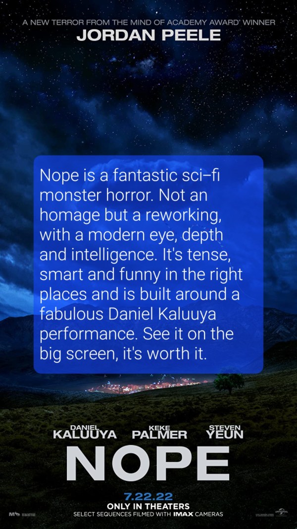 Nope is a fantastic sci-fi monster horror. Not an homage but a reworking, with a modern eye, depth and intelligence. It’s tense, smart and funny in the right places and is built around a fabulous Daniel Kaluuya performance. See it on the big screen, it’s worth it.