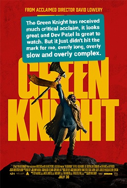 The Green Knight has received much critical acclaim, it looks great and Dev Patel is great to watch. But it just didn’t hit the mark for me, overly long, overly slow and overly complex. Trying too hard to show how smart it was. If you like your Arthurian legend, then this may well work for you, just not for me.