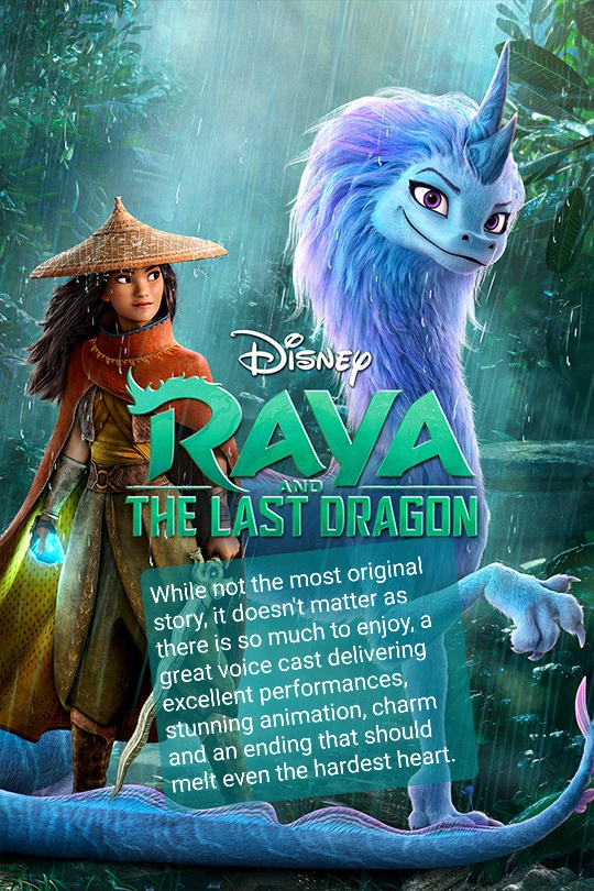 While Raya and the Dragon is not the most original story, it doesn’t matter as there is so much to enjoy, a great voice cast delivering excellent performances, stunning animation, charm and an ending that should melt even the hardest heart. A Disney animation of the quality Mickey and the team will be proud of.
